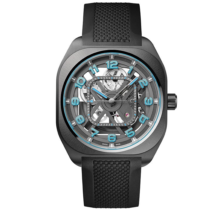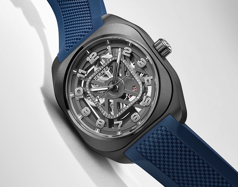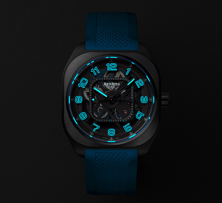 นาฬิกาข้อมือ Hermès H08 Squelette มอบความหลากหลายทางตัวเลือกผ่านสายคาดยางขัดลายขึ้นโครงสร้างในเฉดสีอันลงตัวต่อกรอบตัวเรือนเปลือยหน้าปัดทั้งสองรุ่น ขณะที่รุ่นตัวเลขบอกชั่วโมงสีฟ้าสดทำจาก Super-LumiNova® วัสดุเรืองแสงเร่งความคมชัดให้แก่ทุกรายละเอียดทางงานออกแบบซึ่งอาศัยลูกเล่นขัดแย้งระหว่างเหลี่ยมมุมกราฟิกโดดเด่นอยู่บนสายคาดสีฟ้าสด และสีดำ รุ่นตัวเลข Super-LumiNova® สีเทาไททาเนียมกลมกลืนกับกรอบตัวเรือน คือบทสรุปความภูมิฐานผ่านสายคาดสีน้ำเงินเข้ม, สีเบจอมทราย และสีเขียวโทนกลาง
