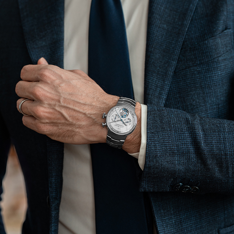 เข็มวินาทีของโครโนกราฟเข็มบนหน้าปัดย่อย และสกรูทั้งสี่ตัวทําจากวัสดุบลูสตีลแบบดั้งเดิม ส่วนกรงทูร์บิญองเคลือบ DLC สีน้ําเงินช่วยขับเน้นองค์ประกอบสําคัญให้โดดเด่นเหนือพื้นหน้าปัดที่ชุบโรเดียมสีเทา สองพื้นผิววัสดุที่ตัดกันนี้เองช่วยเสริมบุคลิกอันสง่างามของเรือนเวลาได้อย่างชัดเจน