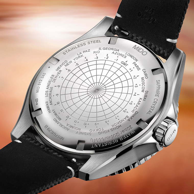สำหรับตัวเรือนครอบด้วยกระจกคริสตัลแซฟไฟร์เคลือบสารกันแสงสะท้อนทั้งสองด้าน พร้อมช่องแสดงวันที่ตำแหน่ง 3 นาฬิกา เม็ดมะยมและฝาหลังแบบขันเกลียว ช่วยเสริมประสิทธิภาพการกันน้ำได้สูงสุด 200 เมตร จับคู่กับสายนาฬิกาผ้าสีดำเดินตะเข็บสีขาว พร้อมหัวเข็มขัดสแตนเลสสตีลสลักโลโก้ MIDO และระบบเปลี่ยนสายแบบรวดเร็ว เพื่อความคล่องตัวในทุกโอกาส โดยขับเคลื่อนด้วยกลไกอัตโนมัติ คาลิเบอร์ 80 (Caliber 80) มอบพลังสำรองสูงสุด 80 ชั่วโมง พร้อมบาลานซ์สปริง นิวาครอง (Nivachron™) ที่ทนทานต่อสนามแม่เหล็กและแรงกระแทก ช่วยเสริมความแม่นยำและความน่าเชื่อถือในการใช้งาน บริเวณฝาหลังสลักรายละเอียดเขตเวลา 24 โซนทั่วโลก พร้อมหมายเลขประจำตัวเรือน สอดรับกับฟังก์ชัน จีเอ็มที (GMT) อันโดดเด่น แม้โรเตอร์ขึ้นลานภายในจะถูกซ่อนอยู่ภายใต้ฝาหลัง แต่ยังคงได้รับการตกแต่งด้วยลวดลาย Côtes de Genève และสลักโลโก้ MIDO อย่างงดงาม สะท้อนถึงความใส่ใจในทุกรายละเอียด และจิตวิญญาณแห่งการเดินทางอย่างแท้จริง